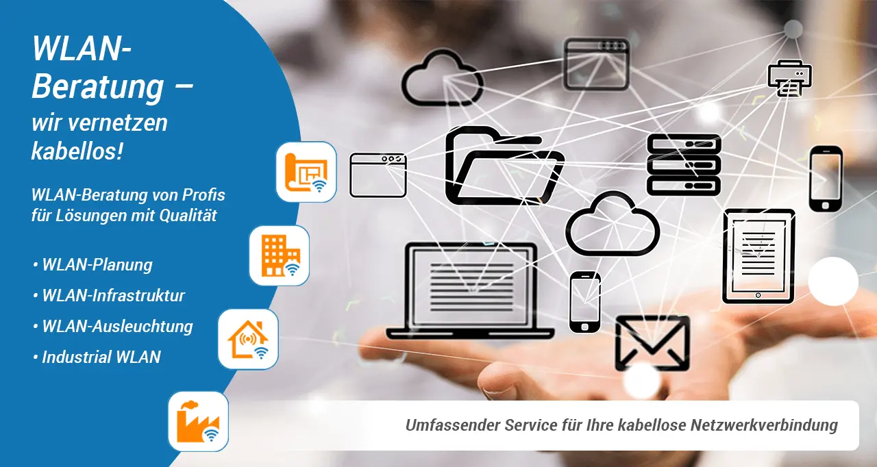 Como uma casa de sistemas informáticos competente e experiente, oferecemos-lhe uma vasta carteira de serviços WLAN. Ajudamos a sua infra-estrutura a alcançar uma infra-estrutura WLAN rápida, segura e, acima de tudo, estável. Lançamos as bases com planeamento profissional WLAN - ou iluminação WLAN - e completamos a nossa oferta com componentes de alta qualidade e a sua colocação em funcionamento. Independentemente de se tratar de indústria, escritórios, escolas ou hospitais - temos o plano para a sua WLAN!